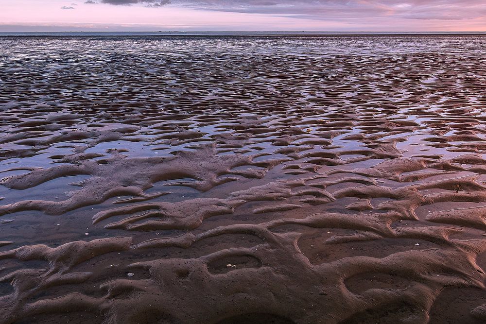 Am Strand von Terschelling, können verschiedene Muster in den Sand bei Ebbe zu sehen. mit einem schönen Sonnenuntergang. Terschelling ist eine der niederländischen Watteninseln. Hier gibt es schöne Strukturen mit einem tollen Himmel.