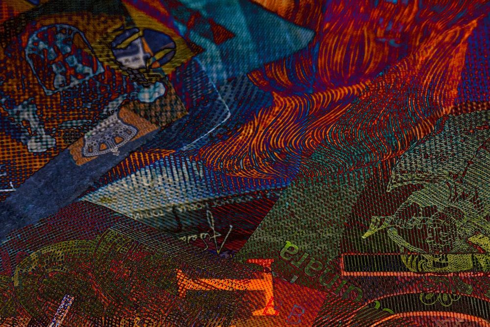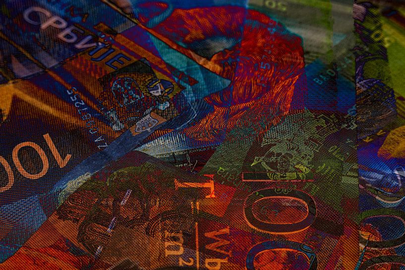 Eine künstlerische Collage aus serbischen Dinar-Banknoten, die durch dynamische Überlagerungen und kräftige Farben besticht. Im Fokus stehen filigrane Sicherheitsmerkmale und die physikalische Formel zu Ehren von Nikola Tesla. Das Zusammenspiel aus kühlem Blau und warmen Erdtönen verleiht der Währung eine moderne, abstrakte Ästhetik.