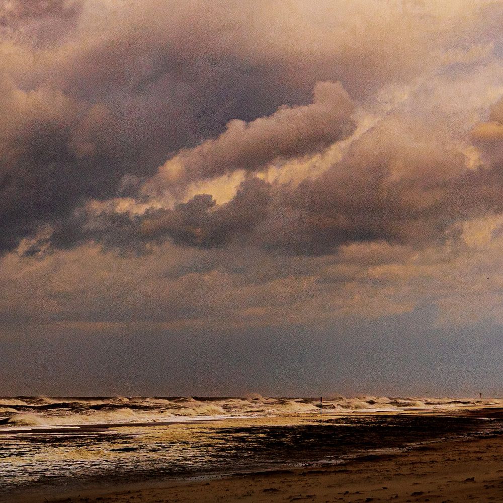 1:1 Format. Bedrohlicher Himmel, dunkle Wolken. Ein durch den starken Wind aufgewühltes Meer. Menschen, die am Strand spazieren gehen, beugen sich gegen den Wind. Wenn man sich zu weit von der Gezeitenlinie entfernt, wird man vom Sand fast weggespült.