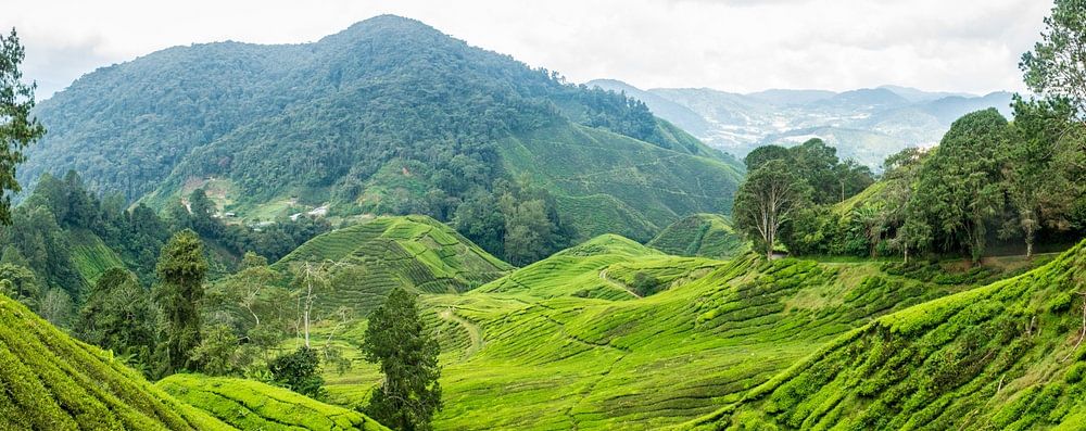 Panoramaansicht der Teeplantage in den Cameron Highlands, Malaysia. Nettes großes Feld der Teeplantage in der vollen grünen Blüte. Dunkle Wolken über den Bergen, den Hügeln und einem Tal Großer Baum und gewundene Wege durch die Teeplantage.
