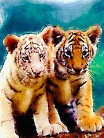 Ein herzerwärmendes Aquarellporträt von zwei Tigerjungen, die eng aneinander geschmiegt sitzen. Die sanften Pinselstriche, lebhaften Farben und zarten Gesichtsausdrücke erwecken ihren verspielten und unschuldigen Charakter auf wunderschöne Weise zum Leben. Die Kombination aus realistischen Details und einem verträumten Hintergrund macht…