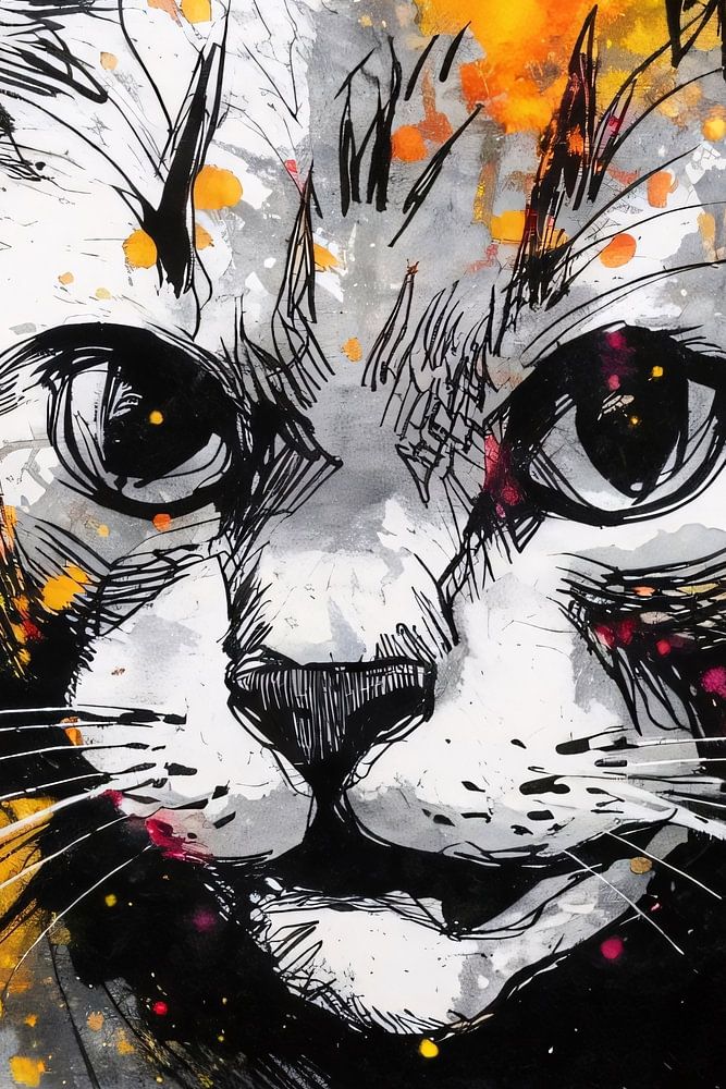 Dieses lebendige Kunstwerk zeigt eine Katze, die in einer dynamischen Tuschezeichnung verewigt ist, umgeben von einer farbenfrohen Explosion aus orangefarbenen und gelben Tönen. Die Kombination aus detaillierten Linien und abstrakten Farbspritzern verleiht dem Bild einen energiegeladenen und modernen Look, der perfekt zu zeitgenössischen Innenräumen passt. Das Design ist sowohl subtil als auch ausdrucksstark und macht es zu einer auffälligen Ergänzung für jeden Raum. Mit seiner verspielten Kombination aus schwarzen und weißen Umrissen und leuchtenden Farben strahlt dieses Werk sowohl Einfachheit als auch Stärke aus. Ideal für Liebhaber von Katzen und moderner Kunst.