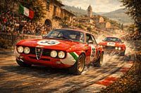Vintage-Rallye-Fahrzeuge rasen durch ein toskanisches Dorf, während die Zuschauer am Straßenrand jubeln. Staub, Geschwindigkeit und dröhnende Motoren fangen die pure Spannung historischer europäischer Straßenrennen ein.