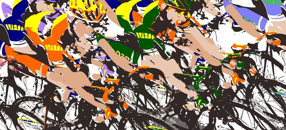 Handgemacht, von Hand digital bearbeitet und von Hand hochgeladen: ein Peloton von Radfahrern in Aktion.