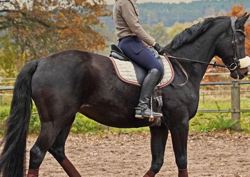 Training mit dem Bayer Rappen Baveria auf einem Reitplatz im Herbst