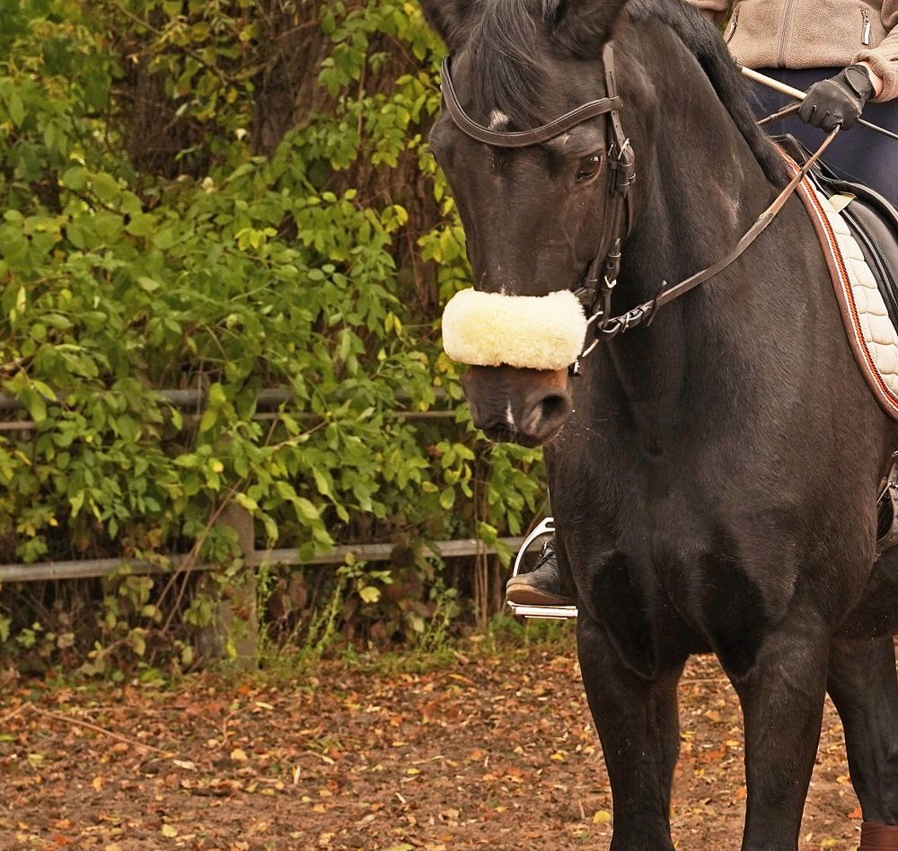 Training mit dem Bayer Rappen Baveria auf einem Reitplatz im Herbst