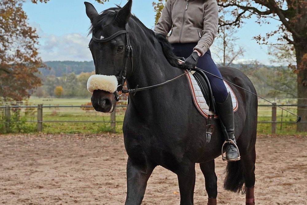 Training mit dem Bayer Rappen Baveria auf einem Reitplatz im Herbst