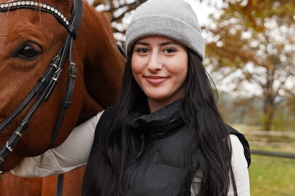 Training mit der rotbraunen Oldenburger Stute auf einem Reitplatz