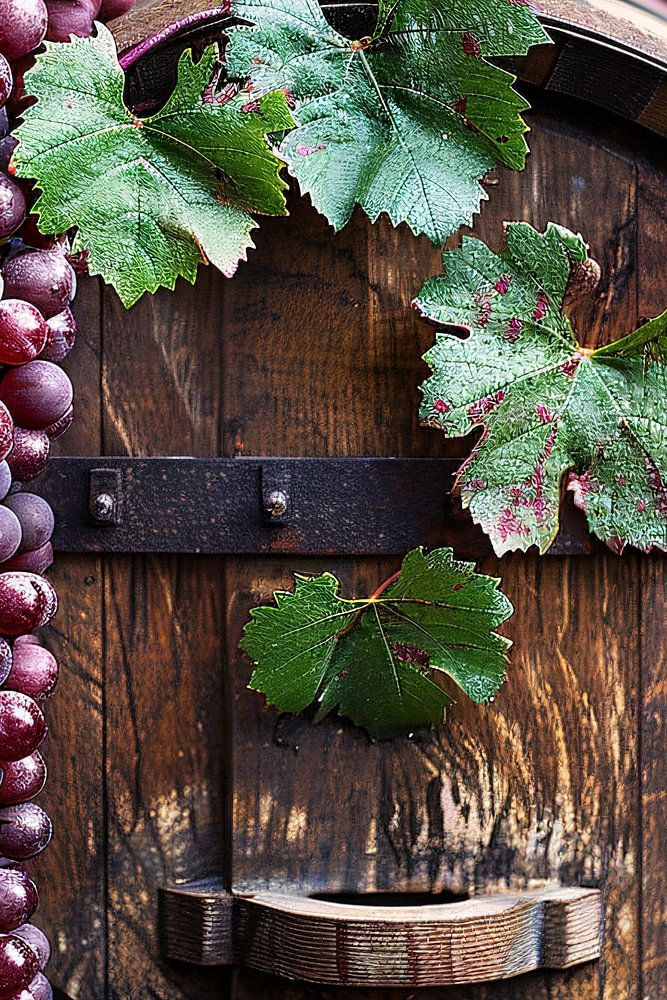 Tauchen Sie mit diesem schönen Motiv in die Atmosphäre eines Weinbergs ein. Eine Traube saftiger Trauben, noch feucht vom Morgentau, hängt anmutig neben einem verwitterten Holzfass. Es ist eine Hommage an die handwerkliche Tradition der Weinherstellung und die rustikale Schönheit der Landschaft. Die warmen Farben und der detailgetreue Realismus erwecken die Essenz der Erntezeit zum Leben. Perfekt für Liebhaber von Wein, Natur und Kunst.