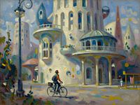 Dieses impressionistisch inspirierte Kunstwerk entführt den Betrachter in eine märchenhafte Stadtlandschaft, in der organische Architektur auf sanfte Pastelltöne trifft. Die geschwungenen Fassaden, verspielten Balkone und weichen Lichtverläufe erzeugen eine fast surreal wirkende Szenerie. Im Vordergrund fährt ein Radfahrer ruhig durch…