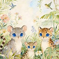 Bringen Sie die Magie des Dschungels in das Zimmer Ihres Kindes mit diesem bezaubernden Aquarellbild aus der Kollektion „The Dreamling Meadow – Kids Collection“. Dieses luxuriöse Kunstwerk in Museumsqualität zeigt drei entzückende Tiere, die sich in einem üppigen tropischen Dschungel verstecken, jedes mit auffälligen blauen Augen, die…
