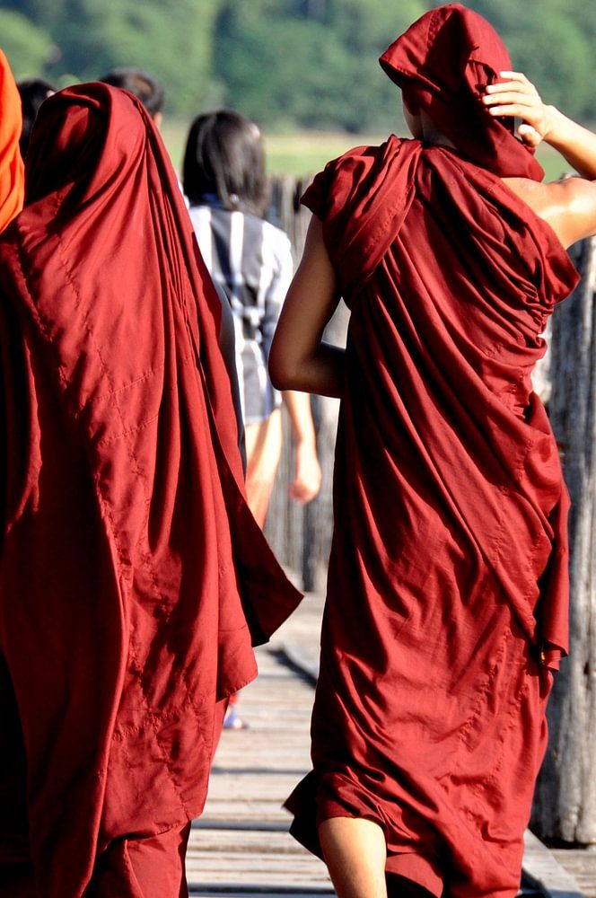 Drei buddhistische Mönche in ihren traditionellen safranfarbenen Roben schreiten langsam über die Holzbrücke von U Bein in Amarapura. Die jahrhundertealte Brücke, die sich über den Taungthaman-See erstreckt, wird für diese Männer, die auf der Suche nach innerem Frieden sind, zu einem Weg der Meditation.