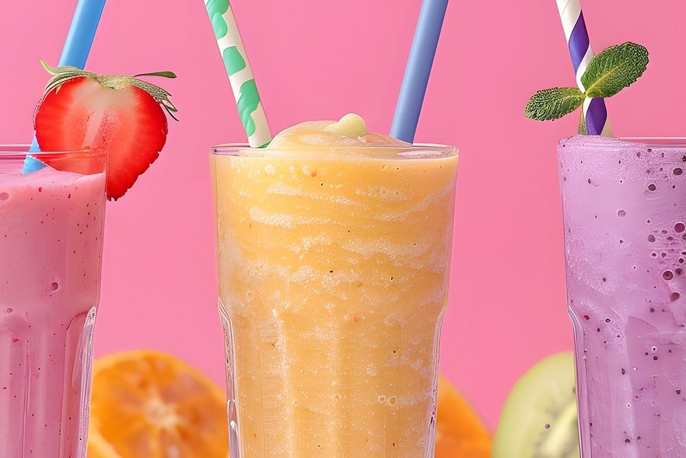 Der Hintergrund ist in Rosa gehalten, sodass die Shakes im Mittelpunkt stehen und den Betrachter sofort ansprechen. Diese visuelle Komposition vermittelt ein Gefühl von Frische und Sommerlichkeit und lädt dazu ein, einen Schluck dieser köstlichen Erfrischungen zu genießen.