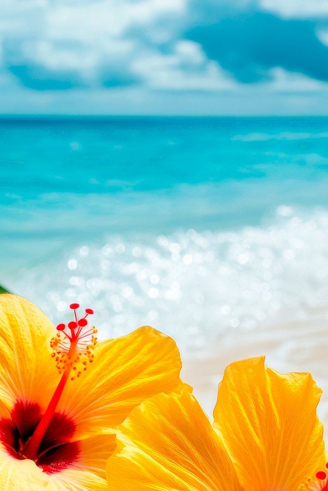 Die strahlenden gelben Hibiskusblüten verleihen der Szene einen Hauch tropischer Eleganz, während die sanften Wellen des glitzernden Meeres im Hintergrund für ein Gefühl von Ruhe und Erholung sorgen. Dieses Bild bringt ein Stück Urlaub in den Raum und eignet sich perfekt für ein Wohnzimmer oder eine entspannende Leseecke.