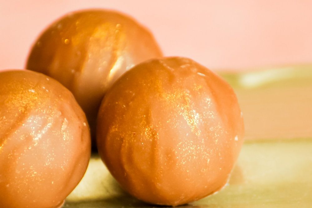 Im Bild sind Trüffelpralinen mit feinem Goldstaub auf einem spiegelndem Tablett zu sehen.