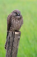 Dieses Foto zeigt einen Turmfalken (Weibchen), der auf einer Stange sitzt. Der schöne weiche Hintergrund bringt diesen Raubvogel wunderbar zur Geltung.
