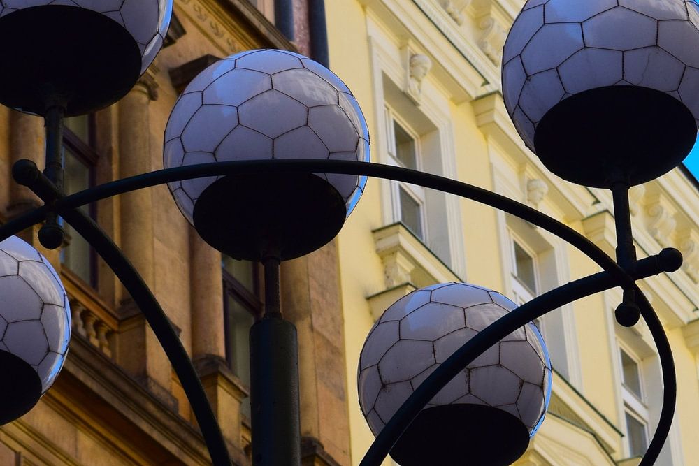 Typischer runder Laternenpfahl mit dekorativen Glühbirnen in Prag, Tschechische Republik, vor klassischer Fassade oder Fassade, vor blauem Himmel im Sommer
