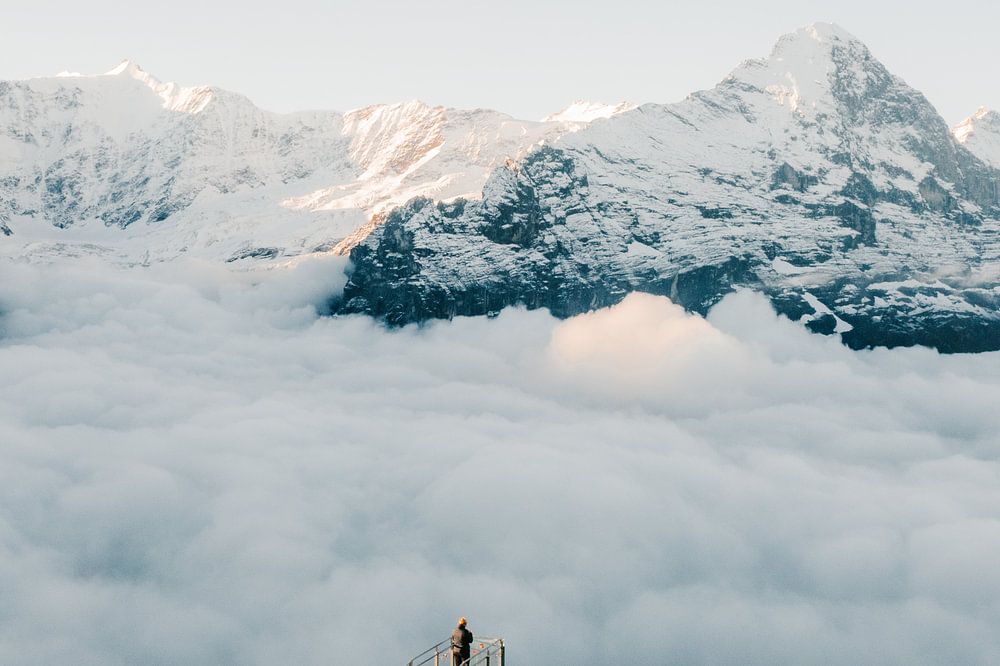 Nach einem Tag öffnete sich die Welt endlich und die Viertausender Eiger, Jungfrau und Co. waren endlich zu sehen. Ich stehe hier am äußersten Ende des First Cliff Walk in Grindelwald, Schweiz.