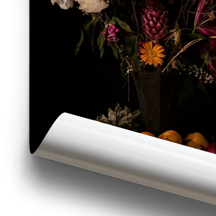 Farbenfrohes Stillleben mit einer Fülle von Blumen und Früchten im Stil der Gemälde alter niederländischer Meister.