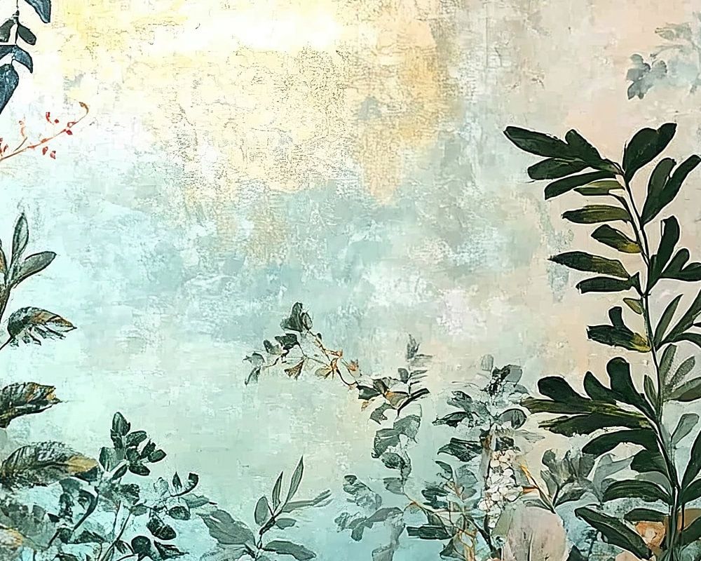 Üppiger Garten in Pastelltönen - Dieses Blumenbild zeigt einen üppigen Garten mit verschiedenen Arten von Laub und Blumen, dargestellt in sanften Pastellfarben und dynamischen Sonnenlichteffekten, die eine Atmosphäre der Ruhe und natürlichen Schönheit ausstrahlen.