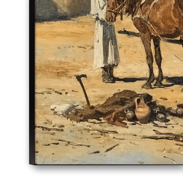 Der "Ungarische Heuwagen" von August von Pettenkofen ist eine lebendige Darstellung des ländlichen Lebens, die die Aufmerksamkeit des Künstlers für die alltäglichen Szenen und Landschaften der ungarischen Landschaft zeigt. Pettenkofen, der für seine Genreszenen und detaillierten Darstellungen des osteuropäischen Landlebens bekannt ist, verleiht diesem Werk eine dokumentarische Authentizität, die ihm sowohl Charme als auch historischen Wert verleiht.