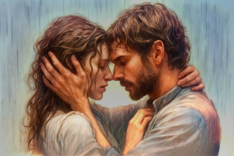 Das Kunstwerk zeigt zwei Menschen, die sich zärtlich umarmen, Stirn an Stirn, wie in einem ruhigen Moment tiefer Verbundenheit. Ihre Augen sind geschlossen, was ein Gefühl von Vertrauen und Hingabe hervorruft. Die Textur erinnert an eine weiche, fast verträumte Bleistift- oder Pastellzeichnung. Die Atmosphäre ist warm, ruhig und voller…