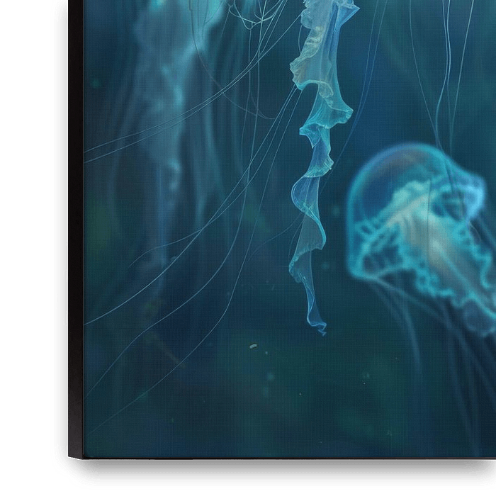 Diese atemberaubende Darstellung einer Unterwasserwelt mit Quallen fängt die Eleganz und Anmut der Meerestiere perfekt ein. Die feinen Details und die leuchtenden Farben der Quallen schaffen eine faszinierende und entspannende Atmosphäre. Perfekt für moderne Räume, die eine inspirierende und beruhigende Dekoration suchen.