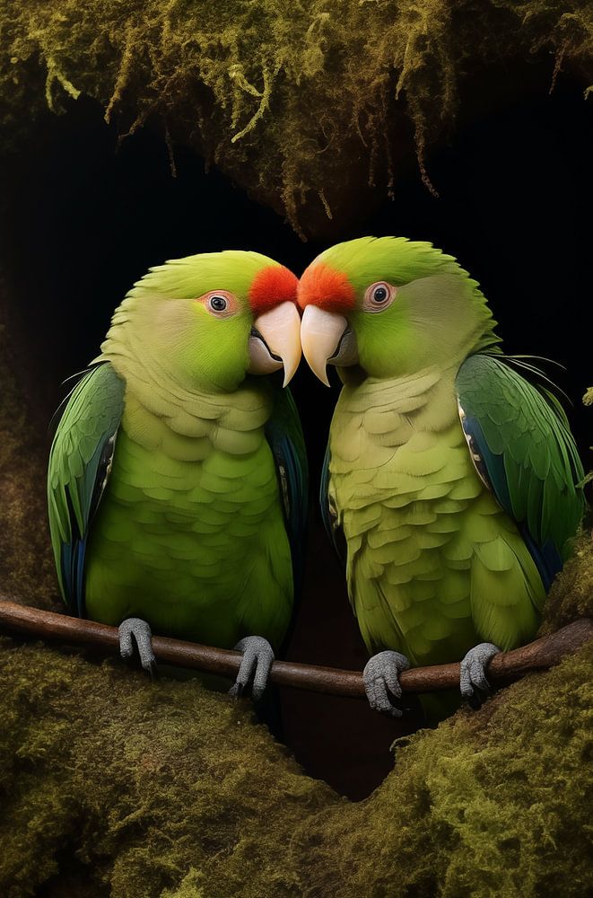 In einem moosbedeckten Baum treffen sich zwei grüne Papageien in einer herzförmigen Öffnung. Ihre roten Köpfe und leuchtenden Federn heben sich wunderbar vom dunklen Hintergrund ab. Eine verspielte und liebevolle Szene, die die Wärme der Zweisamkeit und den Zauber des Regenwaldes zeigt.