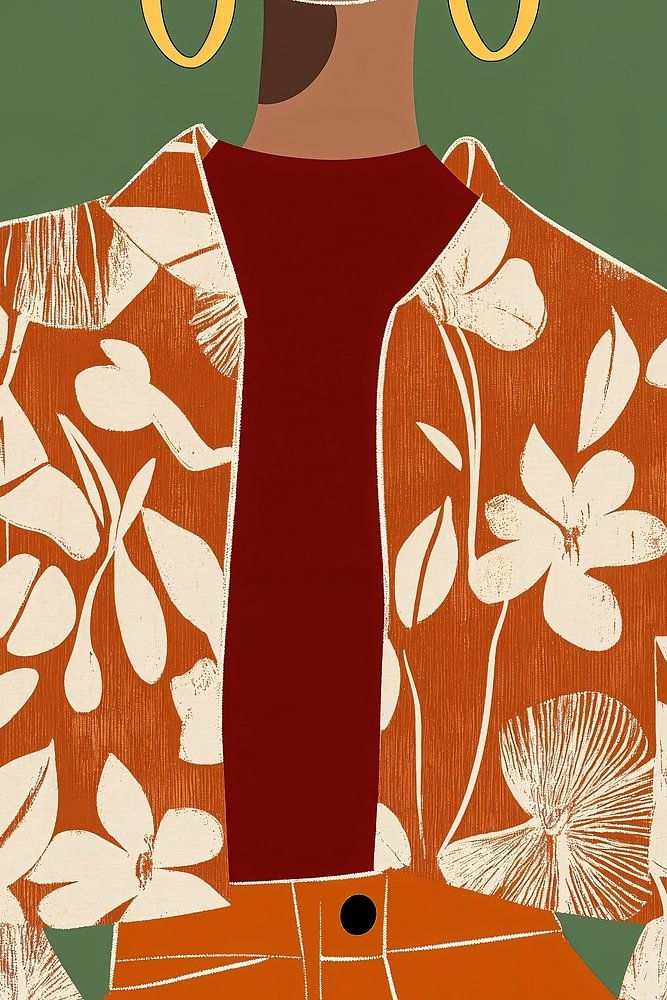 Eine stilvolle Illustration in warmen Herbsttönen, die moderne Mode und botanische Elemente vereint. Das Bild zeigt eine zeitgenössische Komposition mit einer floral bedruckten Jacke in Terrakotta-Tönen, kombiniert mit einem tiefroten Oberteil und einer orangefarbenen Hose. Der minimalistische Stil mit Retro-Touch wird durch den grünen Hintergrund und die goldenen Ohrringe verstärkt und ergibt ein zeitloses Modeporträt.