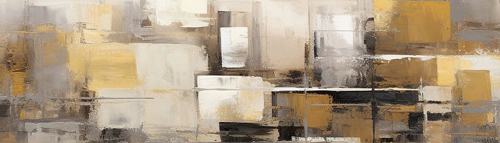Urban Gold Reflection | Abstrakte Kunst - Dieses Gemälde zeigt eine abstrakte Komposition aus vertikalen und horizontalen Flächen, wobei eine reiche Vielfalt an Beige-, Gold- und Grautönen Tiefe und Textur verleiht. Der Hauch von Reflexion suggeriert eine Wasseroberfläche oder einen Spiegeleffekt und verleiht dem Ganzen eine faszinierende Dynamik.