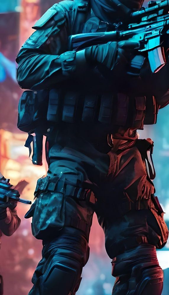 Dieses beeindruckende digitale Kunstwerk zeigt eine Szene voller Action und Spannung, in der bewaffnete Elitesoldaten durch eine mit Leuchtreklamen beleuchtete Straße marschieren. Es zeigt eine Stadt im Konflikt, in der die Grenze zwischen Ordnung und Chaos verschwimmt und die Helden der Nation aufgerufen sind, ihre Pflicht zu erfüllen.