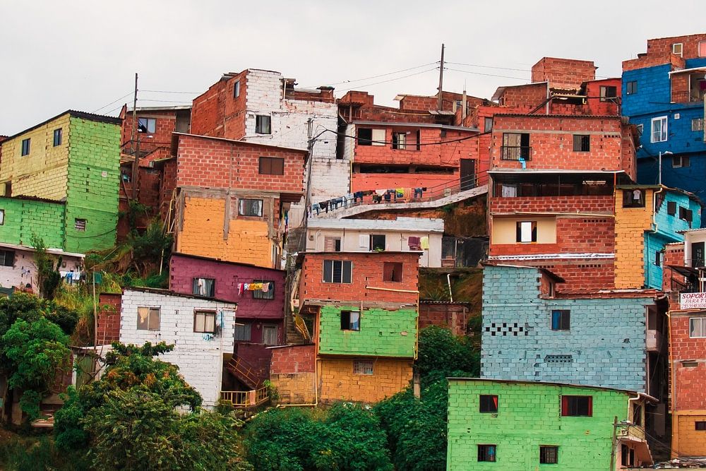 Dieses Foto zeigt die eindrucksvollen bunten Häuser, die sich dicht an dicht an einem Hügel in Medellín stapeln. Die Fassaden in kräftigen Farben wie Rot, Grün, Blau und Gelb erzeugen ein lebendiges Mosaik und spiegeln die Energie und Vielfalt der kolumbianischen Kultur wider. Stromleitungen, enge Wege und kleine Details wie Wäscheleinen oder Graffiti betonen den urbanen Charakter der Szene.
