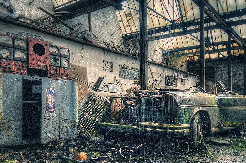 Eine Autogarage, in der eine Menge zurückgelassen wurde, darunter auch dieses Auto. Danke an den Regen, der das Bild vervollständigt. Auf meiner Website www.brunas.nl finden Sie viele weitere Fotos. Wenn Sie etwas gesehen haben, das hier nicht aufgeführt ist, kontaktieren Sie mich bitte.