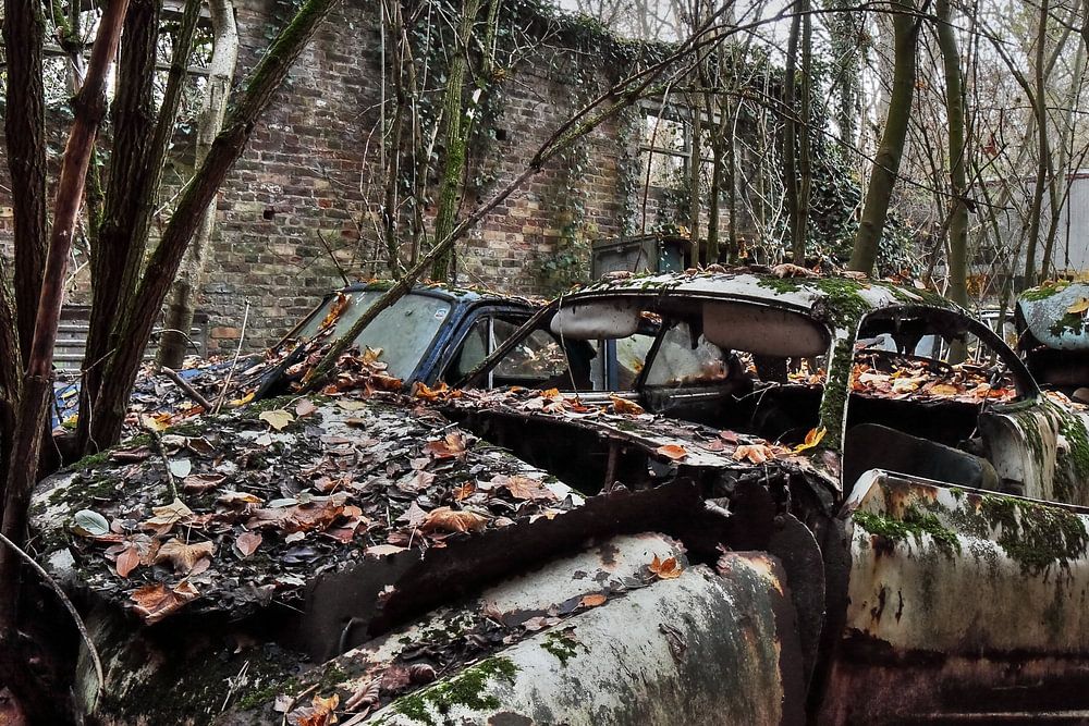 Diese alten Autos stehen seit Jahren bei Wind und Wetter im Freien und haben ihre besten Tage bereits hinter sich.