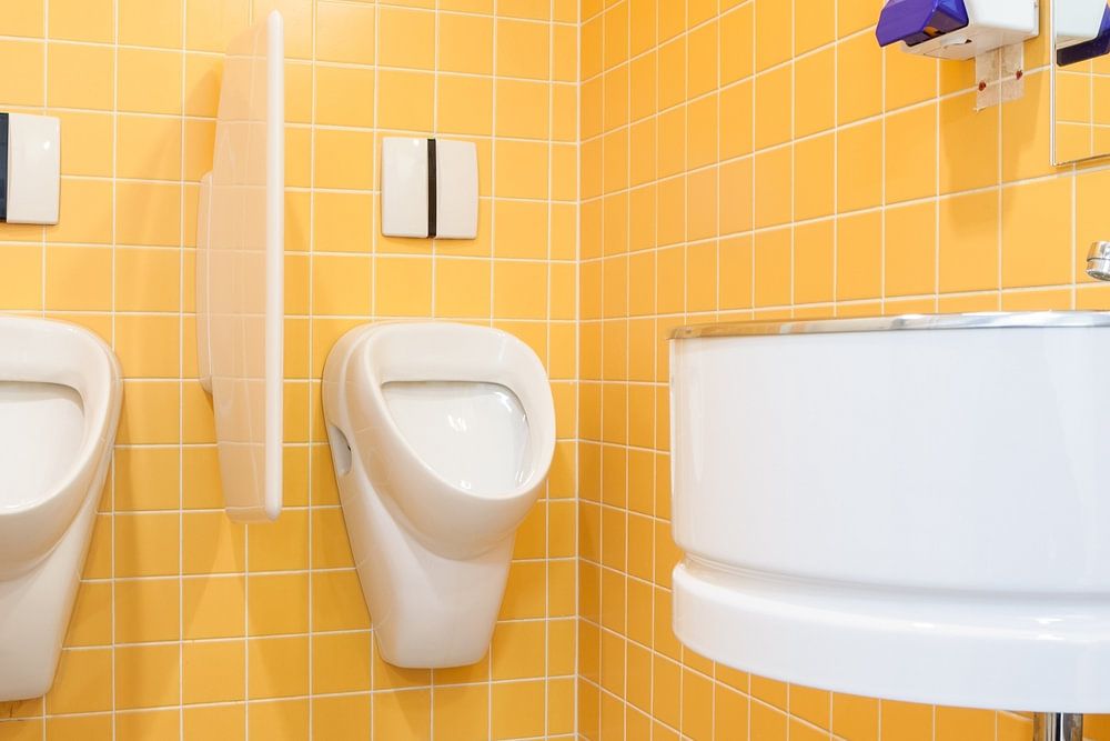Diese Pissoirs befinden sich an einem öffentlichen Ort in einem großen Gebäude und sind für jedermann frei zugänglich.