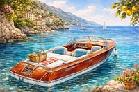 Bestelle diese Malerei Urlaub an der Mittelmeerküste mit einem Oldtimer-Boot von Dodik Hariyono als Reproduktion auf Leinwand, Alu-Dibond, als Poster, Fototapete oder Acrylglasbild.