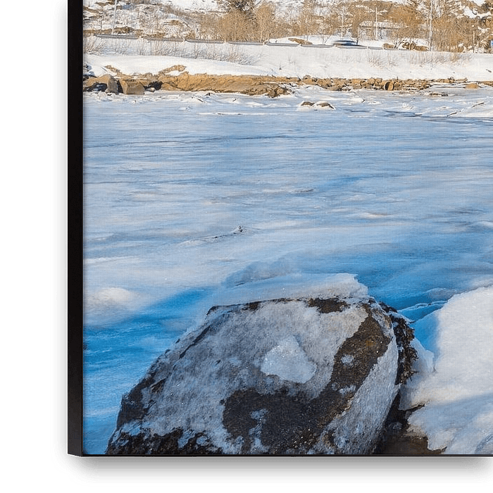 Bestelle dieses Landschafts-Wandbild Vagan Kirche, Lofotkatedralen auf den Lofoten Inseln in Norwegen an zugefrorenem Fluss im Winter bei von Robert Ruidl als Reproduktion auf Leinwand, Alu-Dibond, als Poster, Fototapete oder Acrylglasbild.
