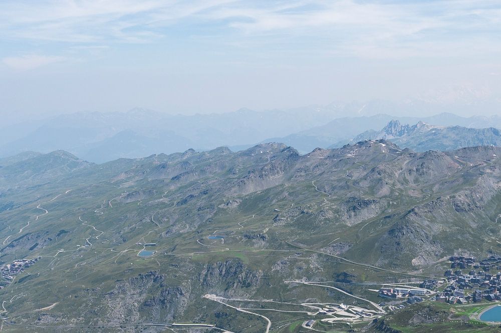 Auf 3200 Metern Höhe haben Sie einen wunderschönen Blick auf die Bergkette rundherum. Sommerliche Berge mit Grün und einigen verstreuten Schneehäufchen.