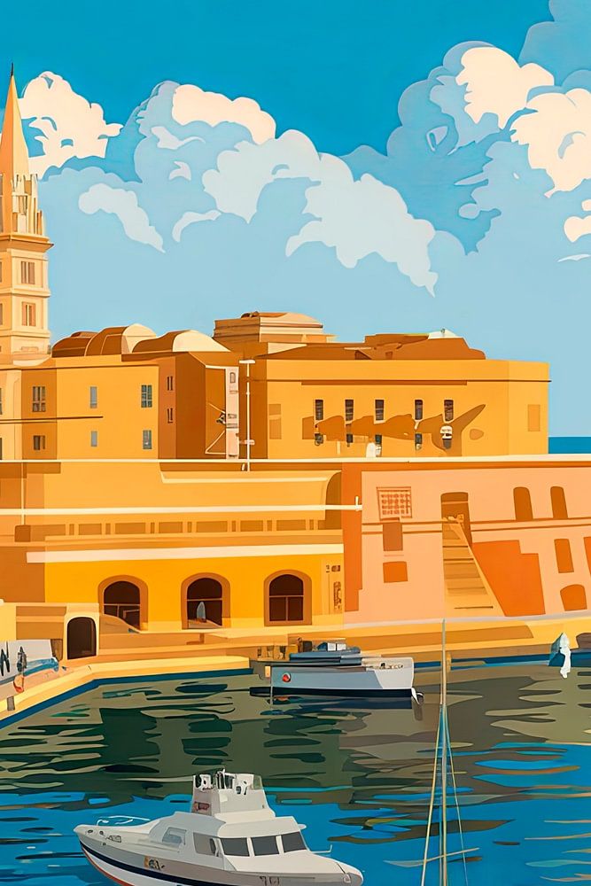 Eine malerische Szenerie entfaltet sich, wo warmes Licht auf die charmante Küstenarchitektur von Valletta trifft. Die sanften Wellen spiegeln die stolzen historischen Gebäude wider, während weiße Segelboote und ein roter PKW das maritime Ambiente beleben. Strahlend blauer Himmel und flauschige Wolken schaffen eine einladende Atmosphäre, die zu quirligem Leben einlädt.