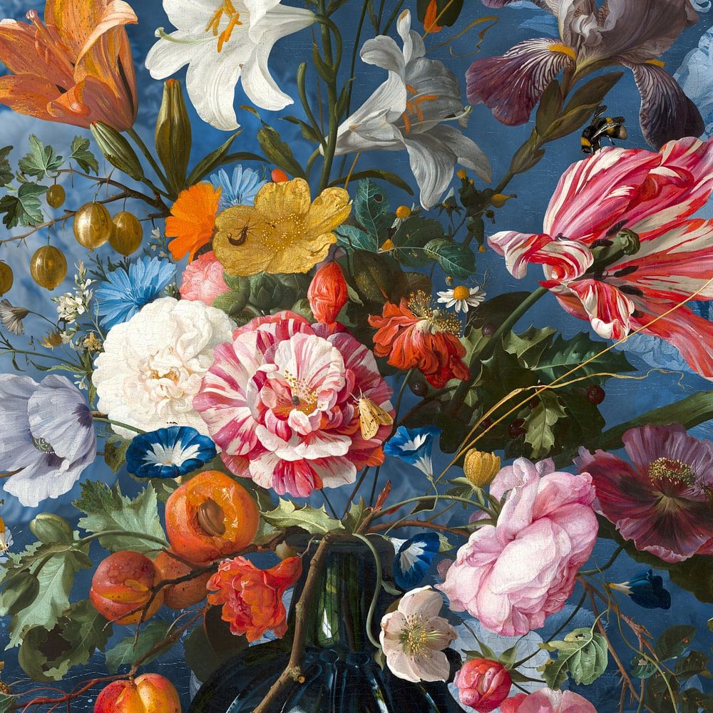 Anno 2022 habe ich die Vase mit Blumen von ihrem ursprünglichen Hintergrund entfernt und sie auf einen Delfter Blau Hintergrund mit Blumen - Tapete - gestellt. Eine besondere Kombination, die überraschend schön ausfiel.