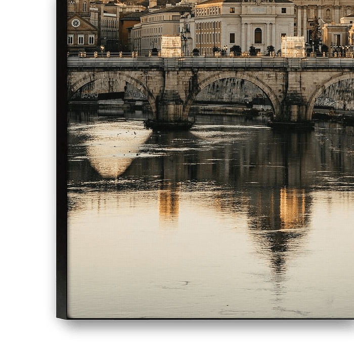 Das Spiegelbild des Petersdoms ist im ruhigen Wasser des Tibers direkt unter der römischen Engelsbrücke zu sehen. Rechts von der Statue kann man einen weiteren kleinen Blick auf die Engelsburg erhaschen, und Vögel flattern am klaren Abendhimmel umher.