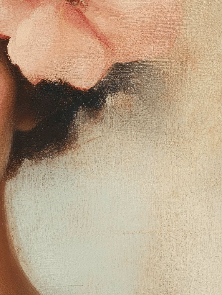 Ein attraktives Halbporträt einer jungen Frau, gemalt in warmen, weichen Tönen. Ihr ausdrucksstarker Blick und die große rosafarbene Blume in ihrem Haar ziehen sofort die Aufmerksamkeit auf sich. Die Kombination aus feinen Pinselstrichen, subtilen Details und einem neutralen Hintergrund verleiht dem Werk ein elegantes, zeitloses Aussehen. Perfekt für Innenräume, die Ruhe, Raffinesse und Charakter ausstrahlen sollen.