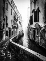 Ein schmaler Wasserkanal fließt zwischen alten, verwitterten Gebäuden in einer ruhigen, heiteren Umgebung. Das Licht scheint sanft durch den Nebel und schafft eine ruhige Atmosphäre in diesem monochromen Bild. Venedig, Italien.