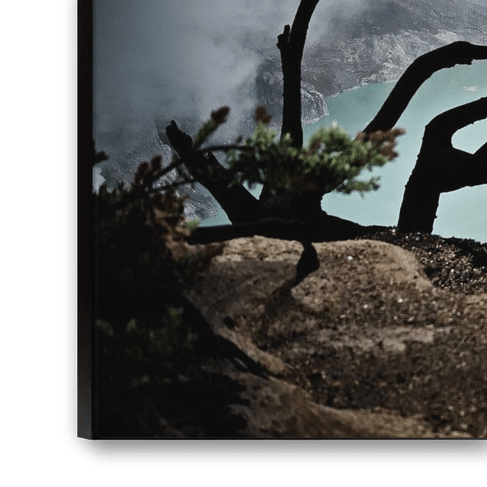 Diese Fotografie bietet einen spektakulären und dramatischen Rahmen über dem Krater des Kawah Ijen, in dem der Säuresee in einem unglaublich kräftigen Türkis leuchtet. Im Vordergrund sind die gewundenen, geschwärzten Silhouetten der verkohlten Äste zu sehen, die Überbleibsel der Brände und der korrosiven Wirkung des Schwefels sind. Diese verdrehten Formen scheinen fast vor dem Abgrund zu tanzen, wie in der Zeit eingefrorene Schatten. Direkt dahinter nimmt der See das visuelle Zentrum ein: Seine Oberfläche erscheint milchig, wie mit Mineralien gesättigt, und spiegelt die Variationen des graublauen Himmels wider. Die steilen Kraterwände zeigen verschiedene Schichten vulkanischen Gesteins, die von hellgrau bis oxidiert braun reichen. Die gesamte Szenerie atmet eine Atmosphäre, die gleichzeitig geheimnisvoll, still und brutal ist. Man hat das Gefühl, eine Welt in ständiger geologischer Bewegung vor sich zu haben, einen Ort, an dem selbst die Luft mit roher Energie und schwefelhaltigem Dampf geladen zu sein scheint. Der Kawah Ijen veranschaulicht hier die Kraft der Erde, ihre bizarre Schönheit und die Art und Weise, wie das Leben trotz der extremen Bedingungen hartnäckig bleibt.