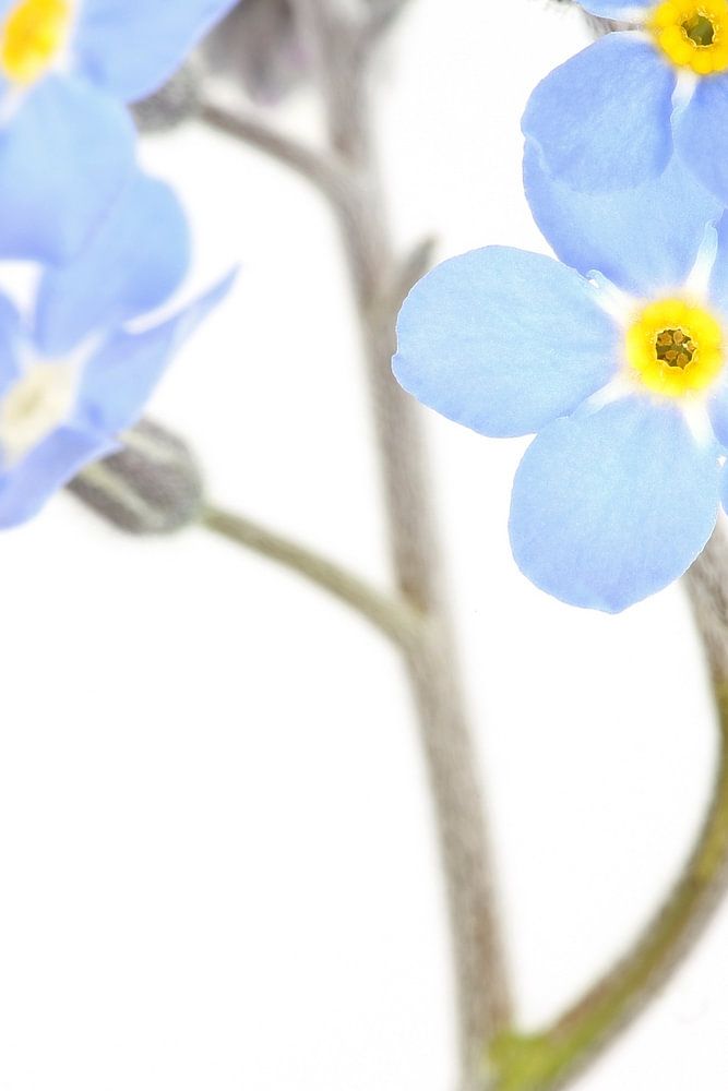 Vergissmeinnicht vor einem weißen Hintergrund. Diese schönen, zarten Blumen verschönern Gärten auf der ganzen Welt. Durch den Kontrast zum weißen Hintergrund heben sich die Blumen ab.