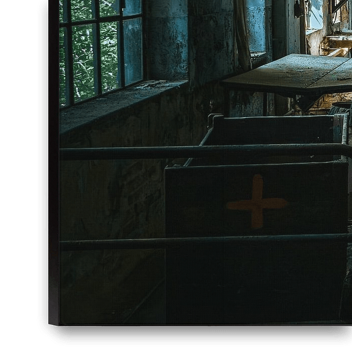 Die verlassene Pelzfabrik, die in diesem Bild dargestellt ist, wirkt wie eine erstarrte Szene aus einer vergangenen Zeit. Der Raum ist voll von alten Möbelstücken, verrosteten Rohren und verfallenden Arbeitsflächen, die durch das weiche, bläuliche Licht beleuchtet werden, das durch die staubigen Fenster fällt. Man kann sich vorstellen,…