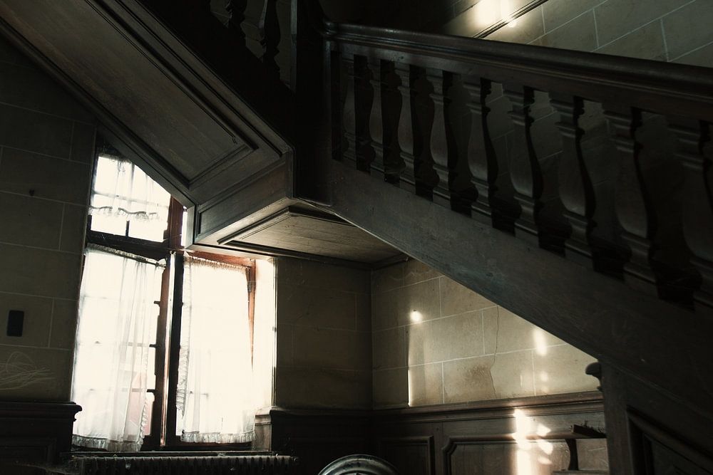 Eine faszinierende Perspektive auf eine Holztreppe in einem verlassenen Schloss, die auf die Decke gerichtet ist, wo Spuren des Verfalls sichtbar sind. Das Spiel von Schatten und Lichtstrahlen verstärkt die geheimnisvolle Atmosphäre, während die klassische Balustrade die Geschichte eines einst majestätischen Ortes erzählt. Eine stille Hommage an den vergangenen Ruhm.