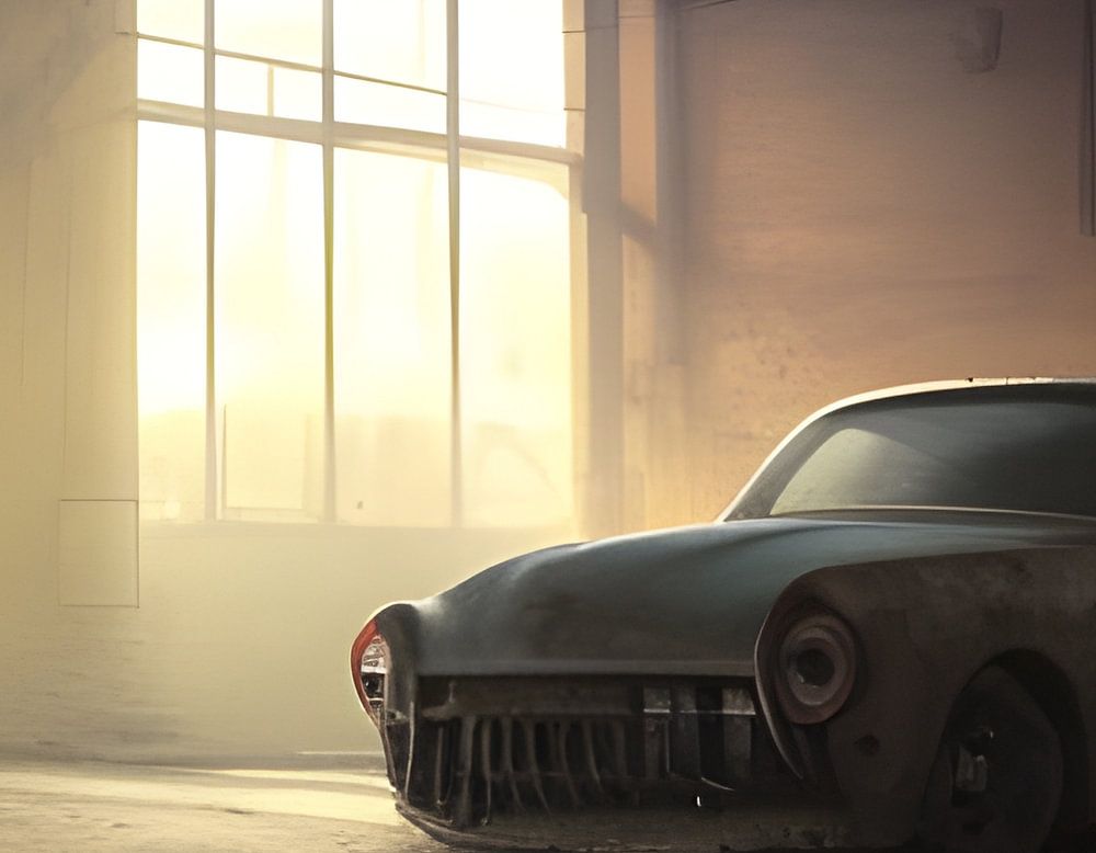 Ein verlassenes, fast futuristisch anmutendes Auto, das in die Zukunft blickt, warum ist das Auto und dieser Ort verlassen?