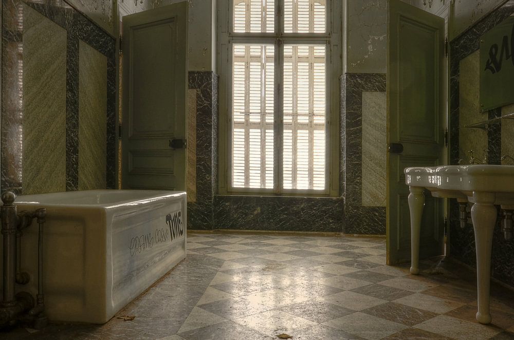 Bestelle das Foto Verlaten badkamer von Kurt Dendooven als Reproduktion auf Leinwand, Alu-Dibond, als Poster, Fototapete oder Acrylglasbild.