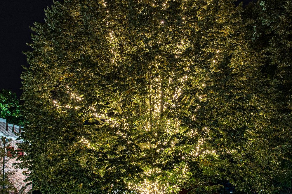 Een boom helemaal verlicht in Waalwijk, achter het gemeentehuis.